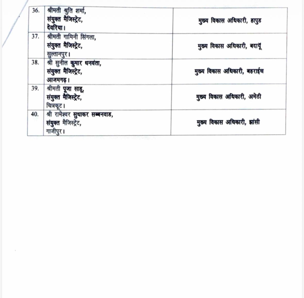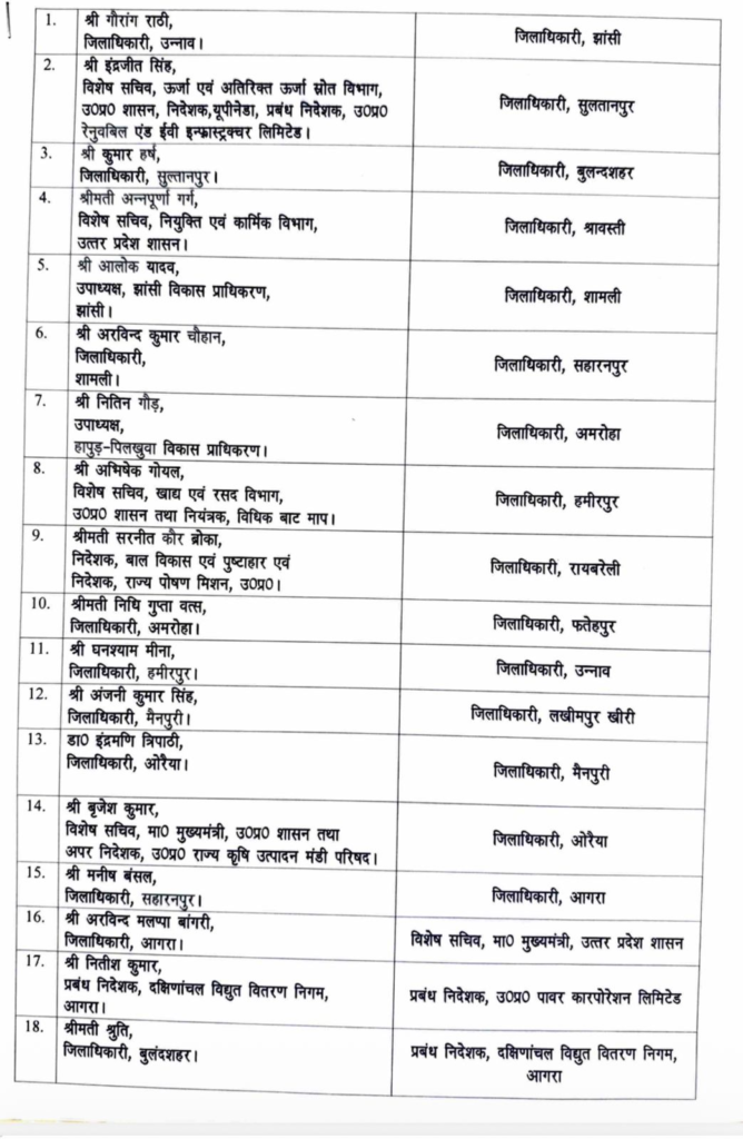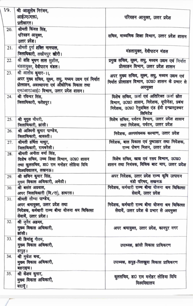 Among other changes, Bulandshahr DM Shruti has been appointed Managing Director of Dakshinanchal Vidyut Vitran Nigam. Jhansi DM Mridul Chaudhary has been moved as Special Secretary in the Tourism Department.
