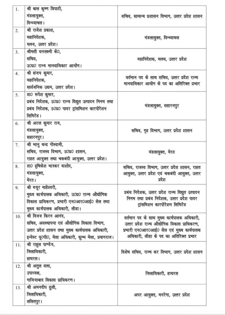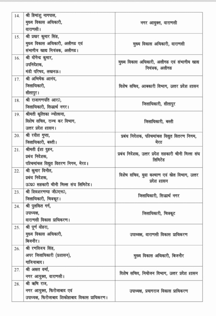 As part of the reshuffle, 10 District Magistrates (DMs) have been transferred. The districts affected include Hathras, Sitapur, Basti, Siddharthnagar, Chitrakoot, Lalitpur, Shrawasti, Rampur, Balrampur, and Kaushambi.