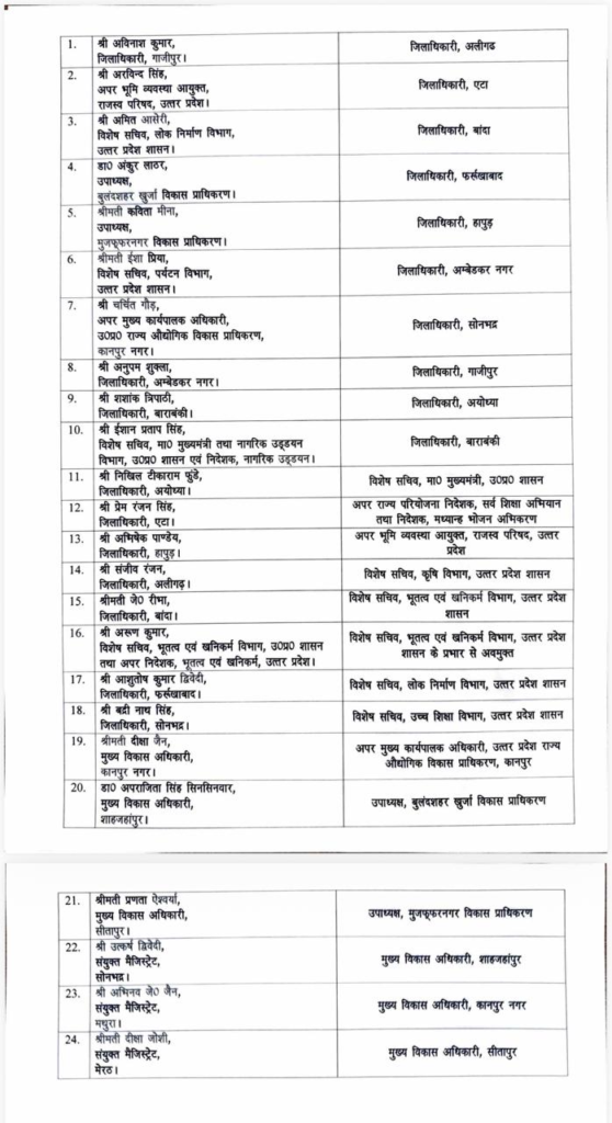 The reshuffle includes the appointment of new District Magistrates in 10 districts—Aligarh, Etah, Banda, Farrukhabad, Hapur, Ambedkar Nagar, Sonbhadra, Ghazipur, Ayodhya and Barabanki.
